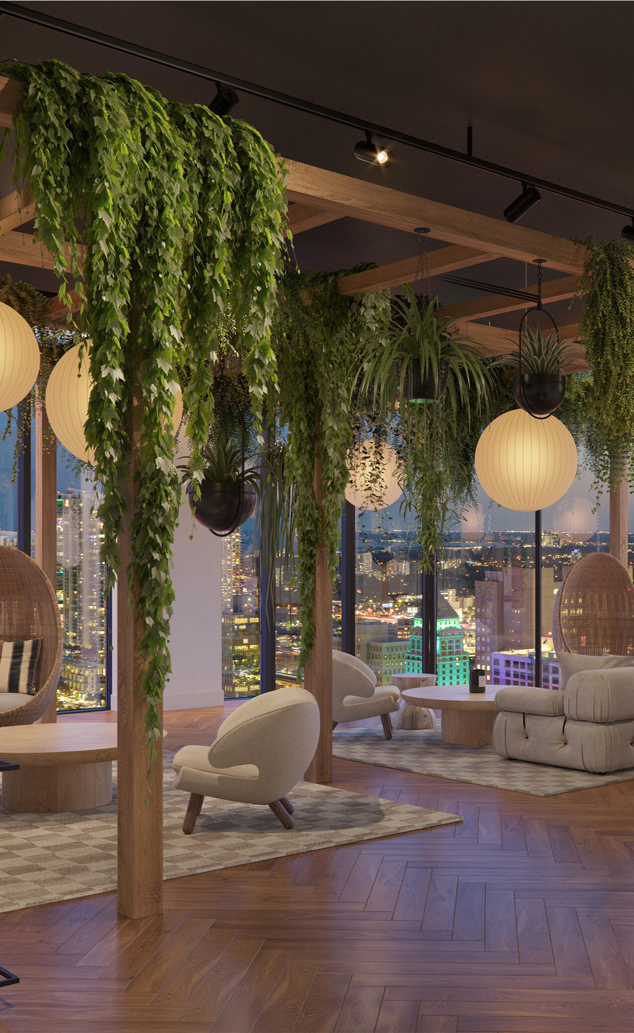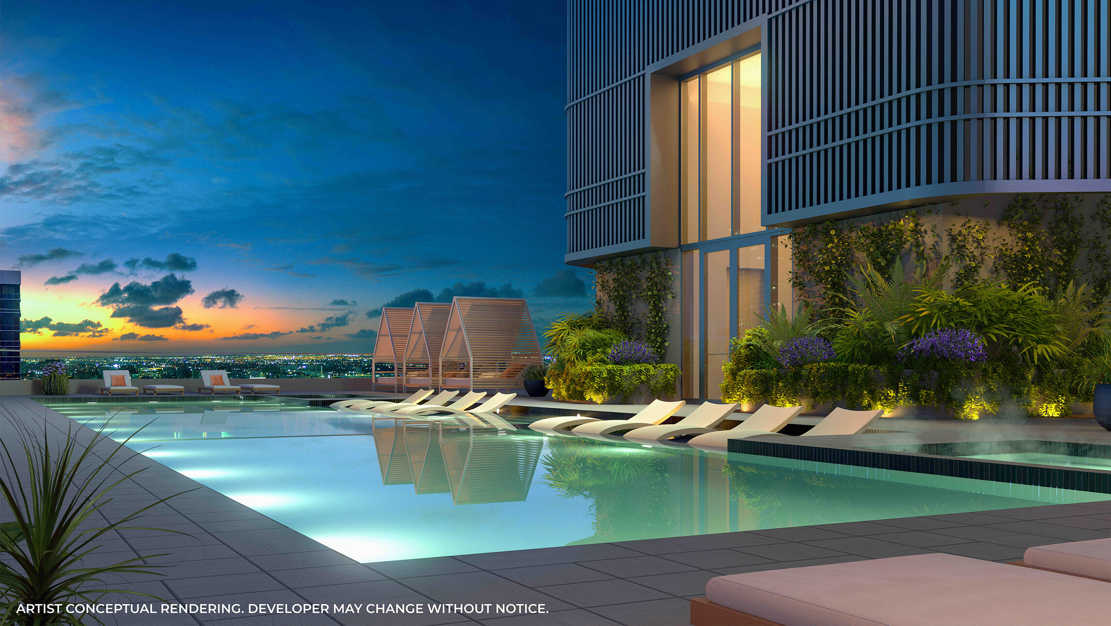• Elegant porte-cochère with 24-7 valet service• Mid-century modern-inspired interior finishes and furniture in residential lobby• Ground floor bistro and bar helmed by GPG Hospitality• Secure bicycle storage in enclosed and air-conditioned space• Pet Lounge• Contactless digital package delivery system• Two-story, double-height amenity area encompassing over 20,000 SF of interior and exterior recreational uses featuring 360-views• Private club and entertainment chef’s kitchen• Media Room• Greenhouse, an urban oasis featuring soothing greenery and plants year-round to relax and unwind at your leisure• Fitness center with indoor gym designed by HOMAGE Fitness featuring yoga/meditation area, private training rooms and sunrise terrace with stunning views